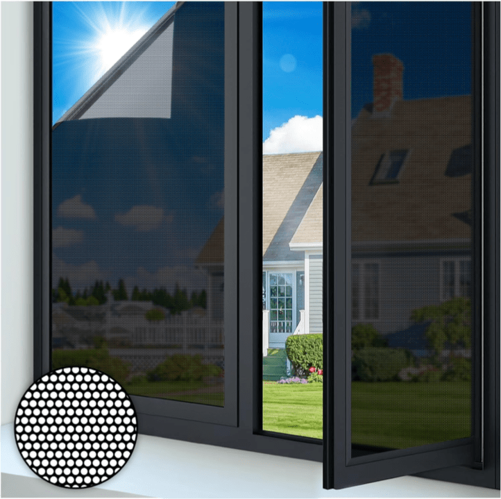 Compared with traditional window films that offer both privacy protection and heat insulation, this product combines customized surface mesh size with digital printing technology. It not only achieves the dual effects of privacy protection and heat insulation, but also effectively reduces light pollution caused by light reflection.
